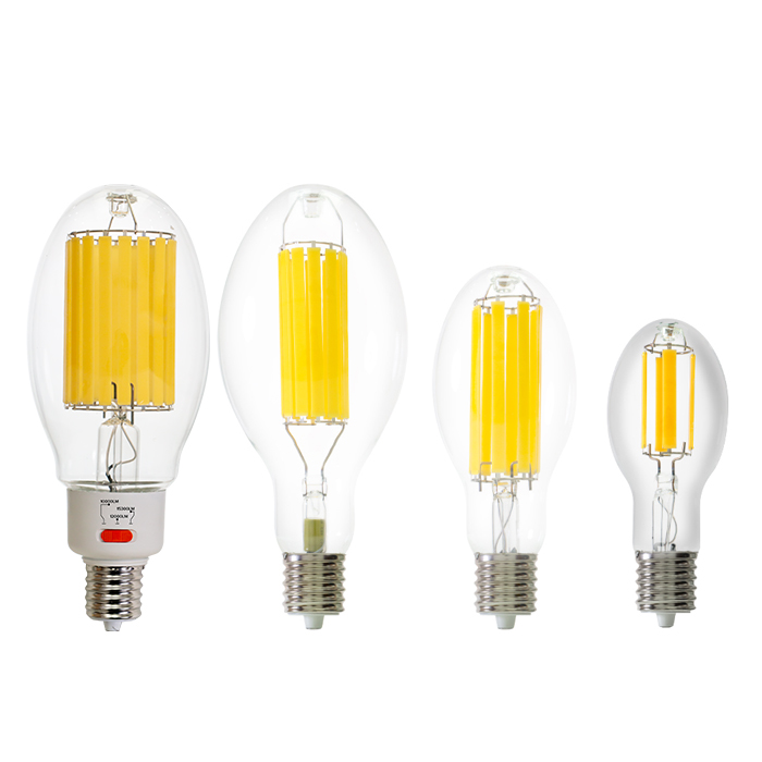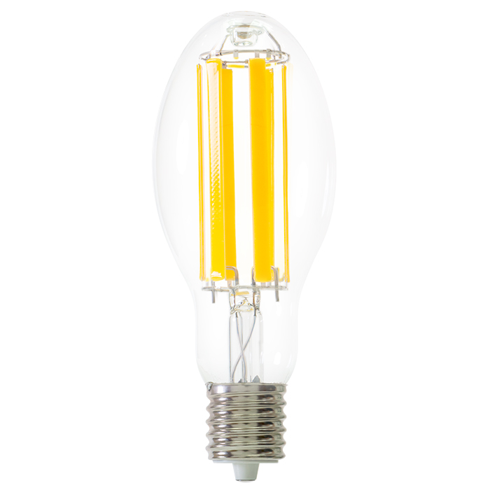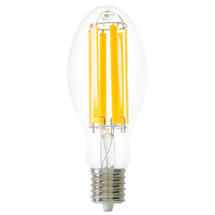 naturaLED® High Lumen Filament LED lamps replicate the traditional design of HID Metal Halide and High Pressure Sodium lamps while delivering significant energy savings. Unlike Corn Cob Style LED lamps, our High Lumen Filament LED lamps feature LED filament rods powered by a glass-insulated circuit, similar to conventional lamps. Available in ED17, ED23, ED28, and ED37 shapes, these lamps are ideal for commercial applications such as post tops, bollards, high bays, and wall packs. They are Ballast Bypass, Enclosed Fixture Rated, offer 360° omni-directional lighting, and provide the highest LPW (200LPW), backed by an industry-leading 5-year warranty.